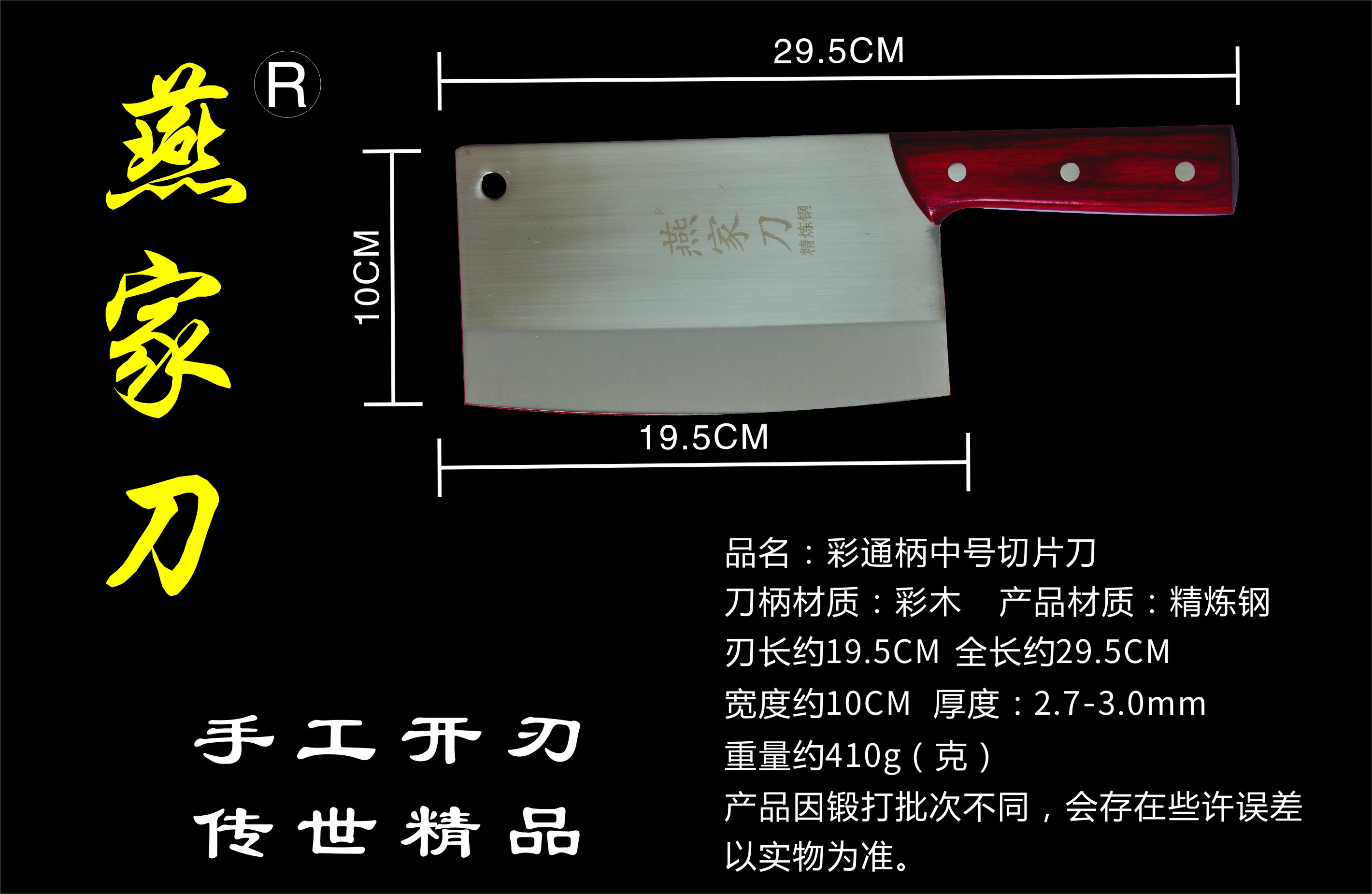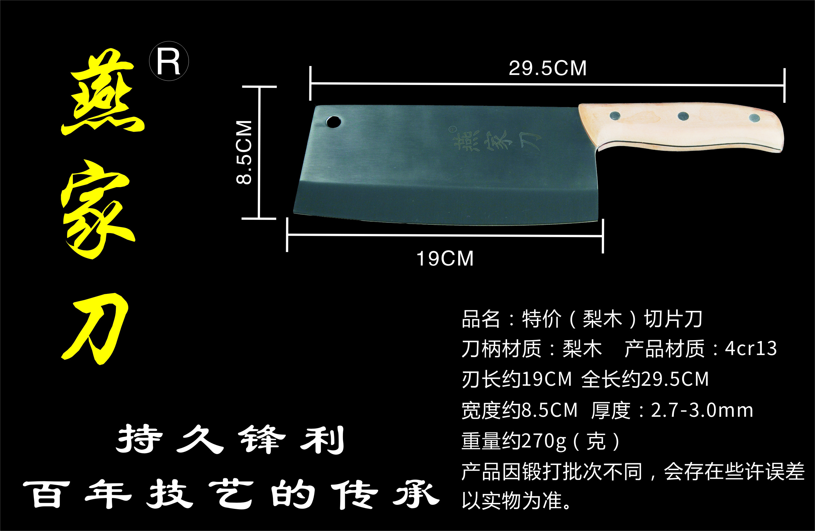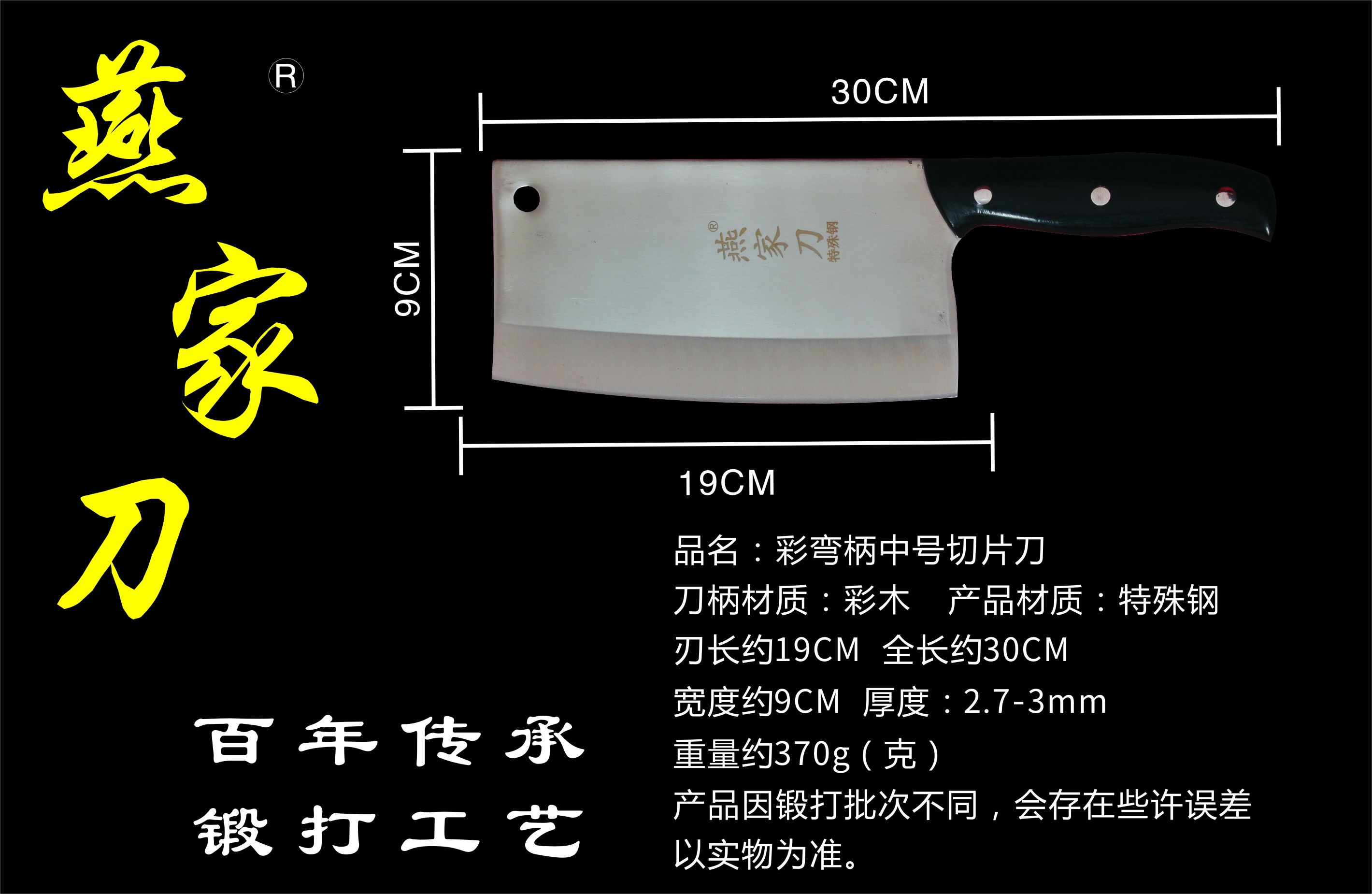樂山燕家刀具有限公司(公司前身為燕佳鐵匠鋪),公司坐落于美麗的佛都之鄉(xiāng)樂山嘉州,在全國各地有上千家代理經銷點,公司專業(yè)銷售、設計、制作各類刀具。秉承一貫鍛造三精要求,即選料精、用料精、工藝精。所選材料全部產自滇東鐵礦優(yōu)產區(qū)。本品牌刀具堅持千挑萬選為材,千錘百煉為刀的手工鍛造工藝宗旨。具有鋒利耐磨、持久耐用,用料上乘,硬度高、韌度強的特點!